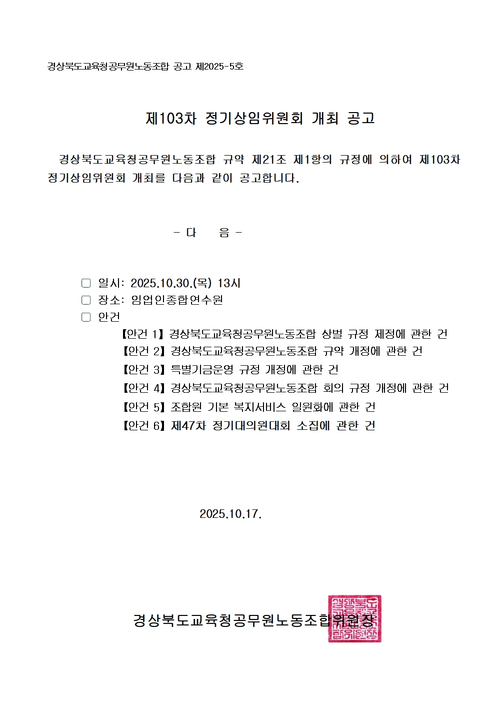 Á¦103Â÷ Á¤±â»óÀÓÀ§¿øÈ¸ °³ÃÖ °ø°í