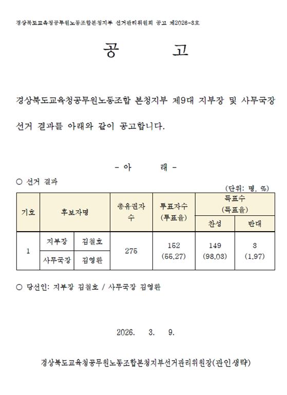 Á¦9´ë °æºÏ±³À°³ëÁ¶º»Ã»ÁöºÎ ÁöºÎÀå ¹× »ç¹«±¹Àå ¼±°Å °á°ú °ø°í